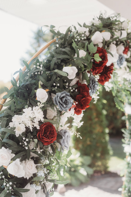 The outdoor ceremony took place at the lakeview gazebo at Orchard View Wedding and Event Centre. While the lake sits just beyond the ceremony area, the gazebo itself is tucked into beautifully maintained gardens and surrounded by mature trees and manicured hedges, creating a private, romantic setting.